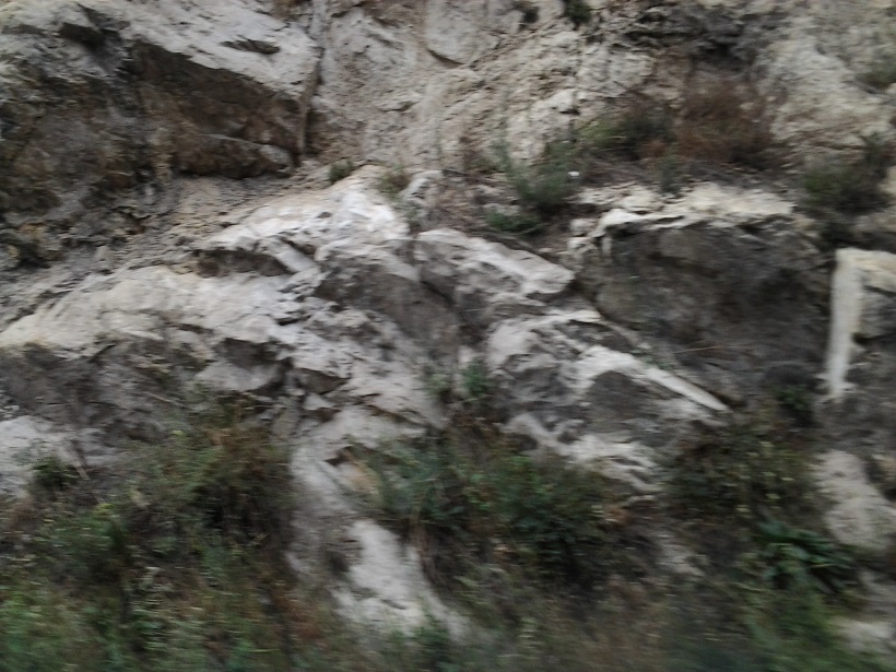 A photograph of a cliff while driving